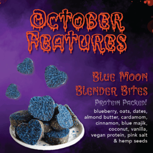 blueberries, oats, dates, almond butter, cardamom, cinnamon, blue majik, coconut, vanilla, vegan protein, pink salt & hemp seeds